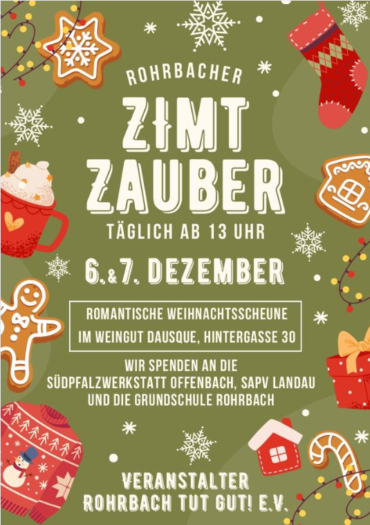 05.12.2025 Zimt Zauber Aufbau ab 18:30 Uhr 06.12.2025 Zimt Zauber im Bereich Ausgabe von Essen 07.12.2025 Zimt Zauber im Bereich Ausgabe von Essen und abends beim Abbau